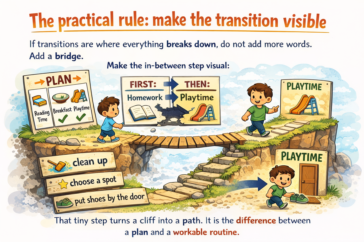 Pick one daily routine. Use two steps. Make the transition visible. Repeat.